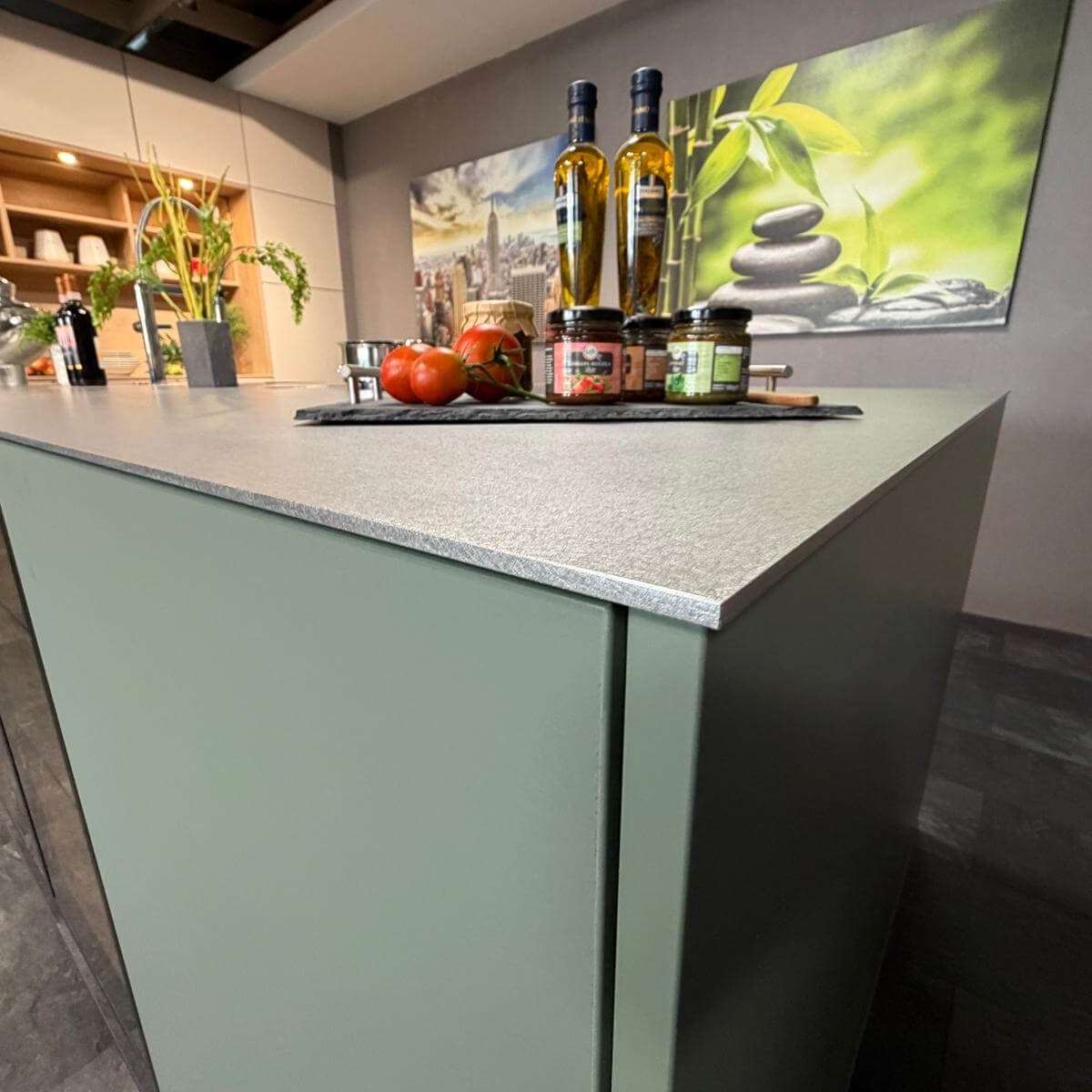 Griff: aufgesetzte Griffleiste – Edelstahl + Girffmulde bei Inselrückseite